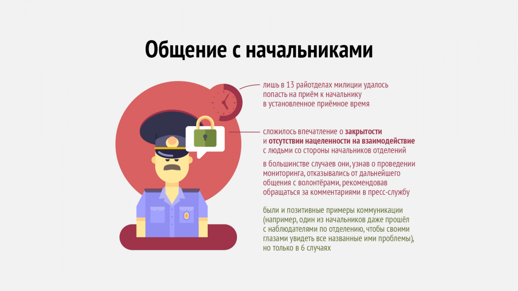 Волонтеры изучали сайты милицейской системы, вели визуальное наблюдение в отделениях милиции, а также посещали начальников отделений в их приемные часы. Было исследовано 24 отделения.